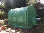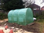Next phase was to put the cover on. In the first instance, we got it inside out. So taking off, started again. Slid it over the frame quite nicely and neatly after the sticking on of anti hot spot tape. I don’t want the skin burning! Fits very snugly, very closely. As mentioned before, we had wonky trenches. These now corrected, allowed the poly to sit fairly flush. The frame has a skirt, so the dirt from the trenches was now shovelled back onto this. Allowing the poly to have additional anchoring and support.