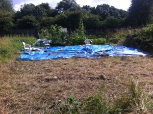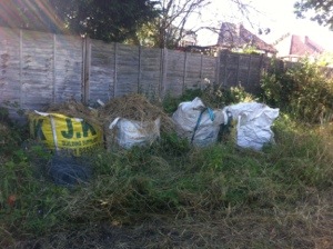 There are a lot of builders bags at the back, I know. All to be used, filled with waste and autumnal leaves. The Wendy house is there, as are the raised beds, daleks and water buts. In addition, there is the top end. Sukh shanti garden at the bottom is separated from project Othello by the arch.