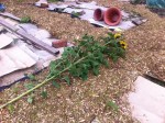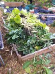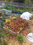 Most of the summer squashes have now ceased fruiting, and do nothing but sulk. These were chopped down and taken up today, with the dismembered components but into a raised bed. This was a bed, that this year had contained king edwards potatos. These were grown in horse poop, but the bed had sunk; with the poop decaying. It was very shallow, so in need of topping up. With the daleks quite full, the remnants of the squashes were piled into the bed. Quite bulky at the moment, lots of green material. This, with the leaves should decay down into some growing medium. There is plenty of time over the winter before next years growing season.