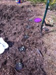 With the area dug over, chicken poop was added. Each plant was plugged in, with a dose of lime. Watered, with blue pellets of doom added around the cabbage collars; the protective cage was the next step.
