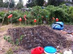 Yes, the canes are flimsy. In places, there are actually two or three under the pots. Green cabbage netting has been draped over, and weighted down with bricks. The dimensions of the netting are a bit off, so we’ve attached another net across one side and horticultural fleece on the other.