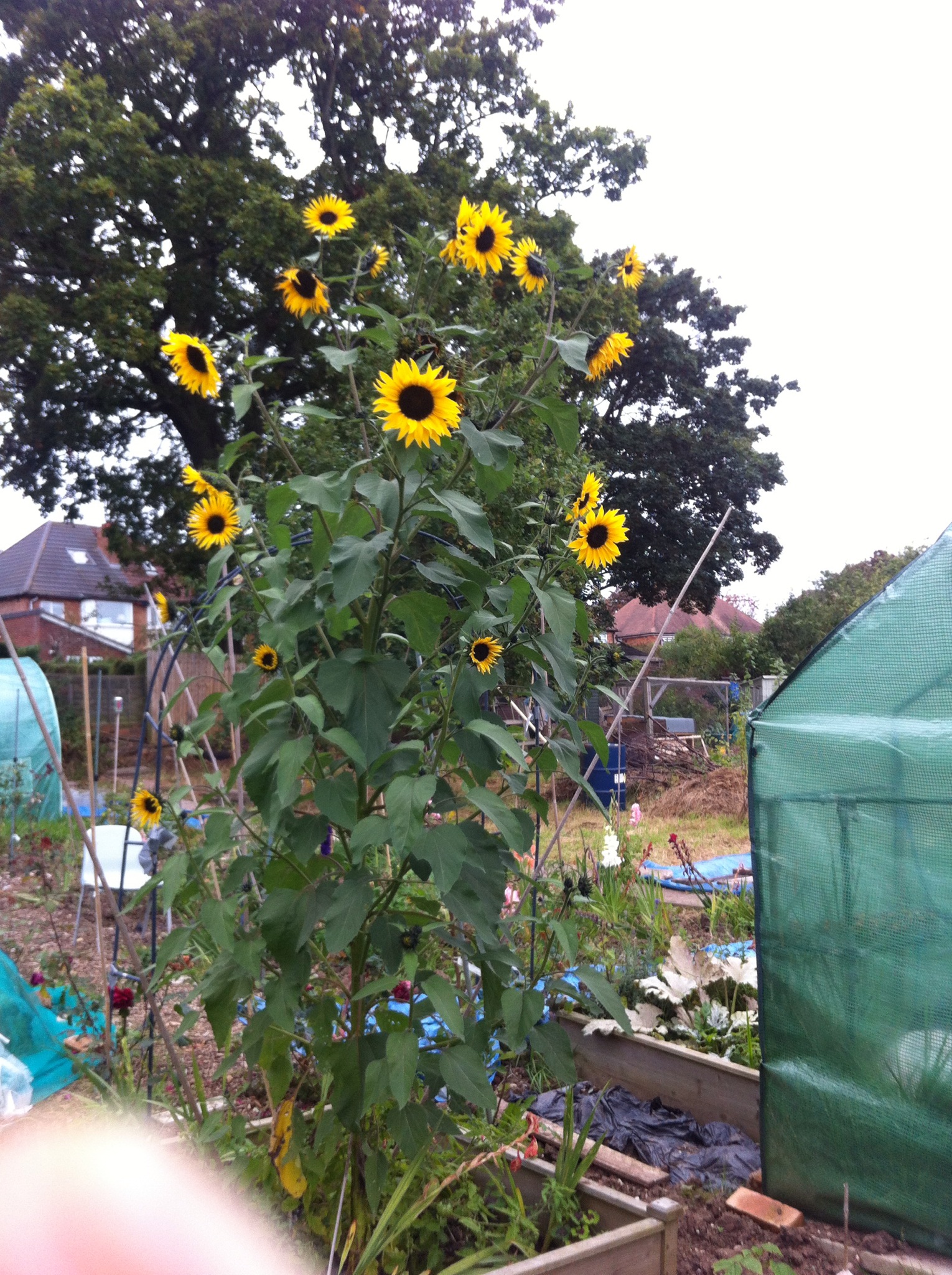This is the only sunflower that has survived this year. As you can see, ids something of a seven headed hydra.
