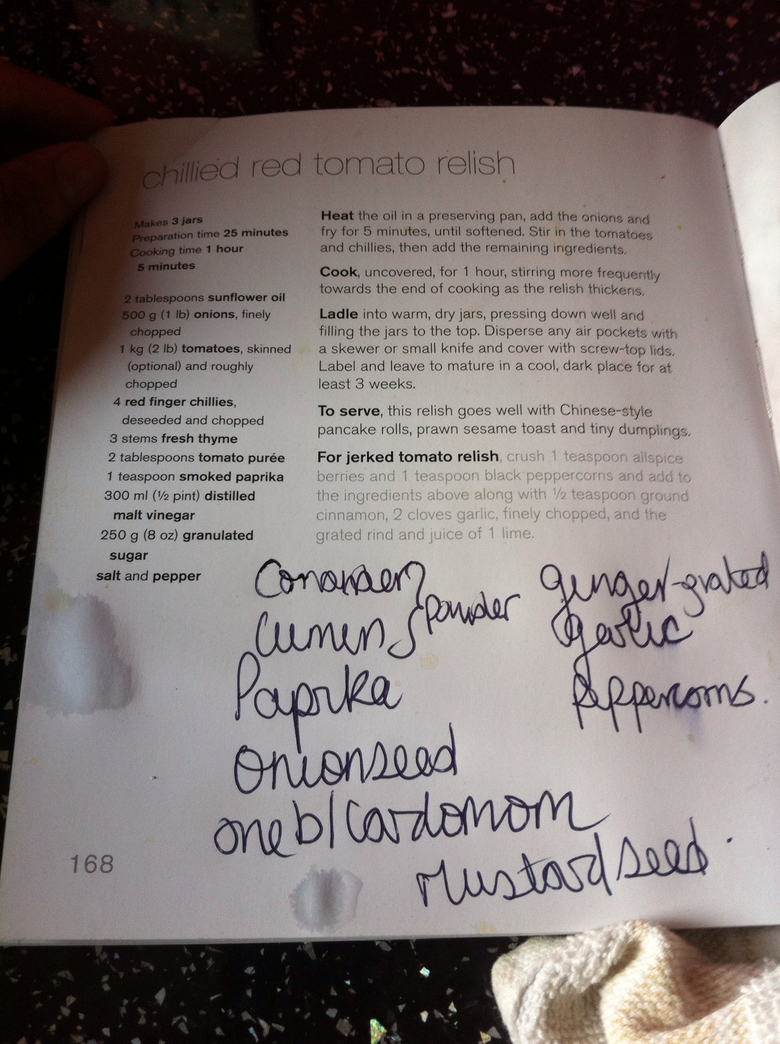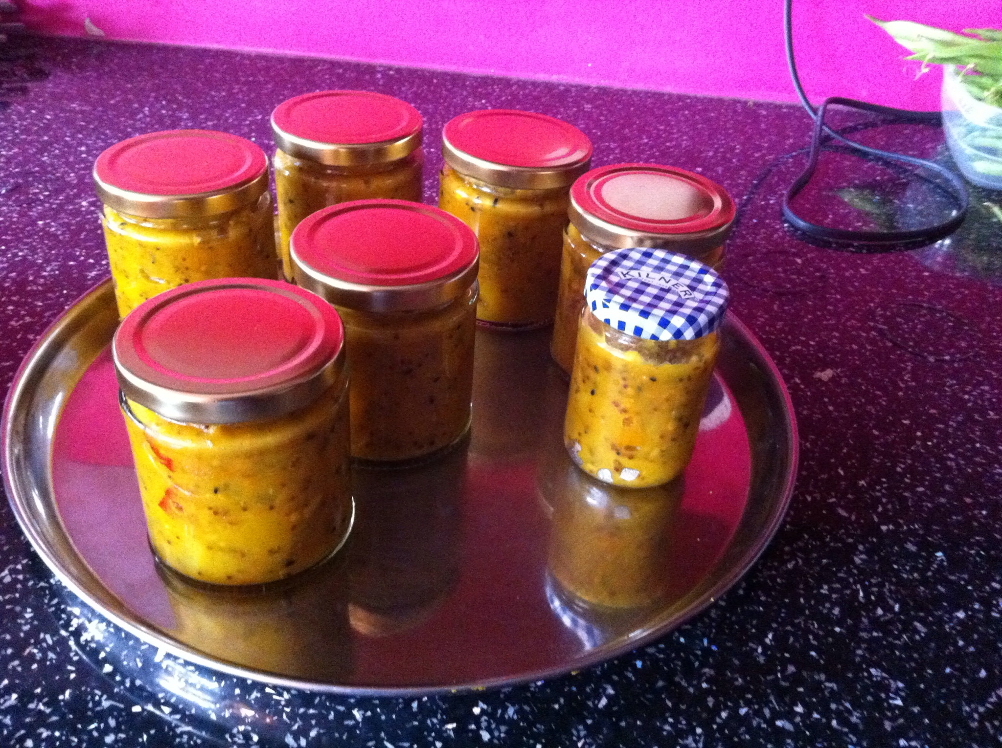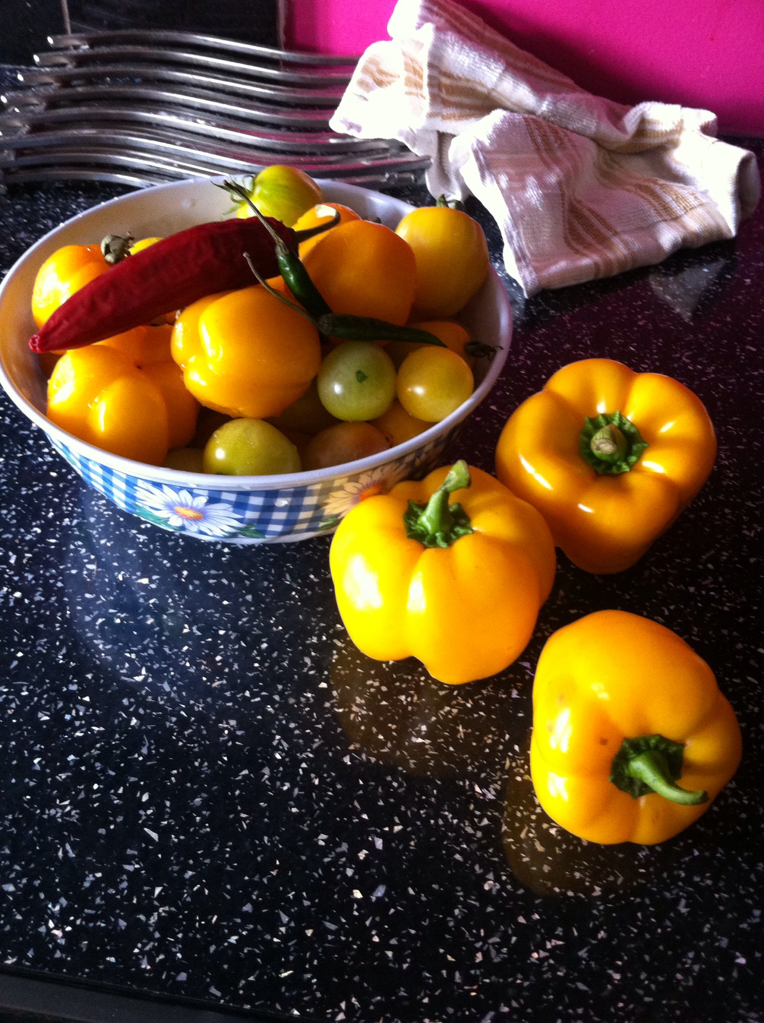 This is it. The one and only reason growing yellow tomatoes. I wanted to make a yellow tomato chutney relish thing. This is an recipe for chillied tomato relish that I have adapted. You will see from the image what has been added. Whilst I have failed to grow any orange habaneros, two hot Thai chillies did find their way into this relish as well as one big red one and two green birds eyes. I have plumped it all out with yellow peppers.