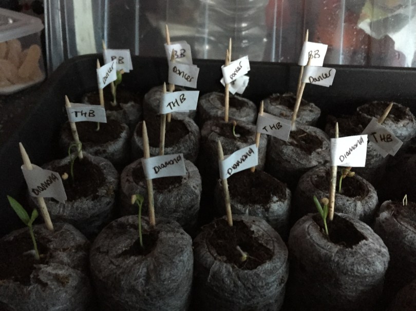 The pots are jiffy pellets. The seeds were sown into them, as they had been expanded with water. The flags, are cocktail sticks with a piece of typist label stuck to it.