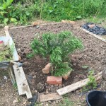 Mum has rather successfully cultivated two epic sized rosemary bushes. And they were taking over the garden path. So armed with my fork, she dug them up. We then trundled down to the plot with them. Again, she took up a gardening spade and dug two holes to plug them in.