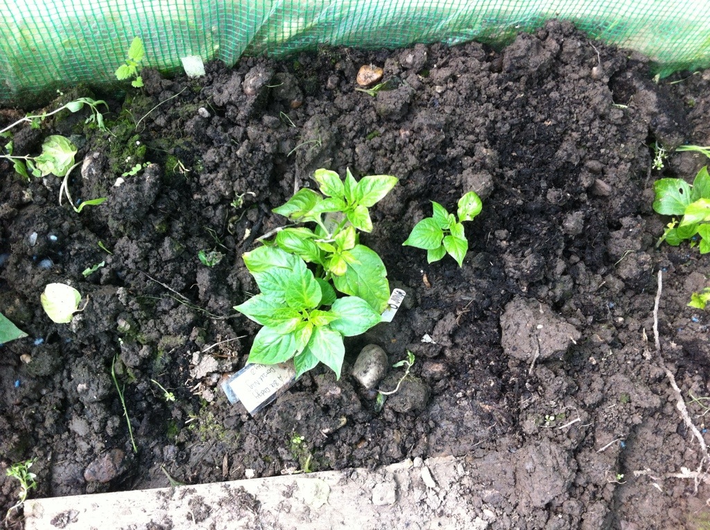 A vista of the polytunnel as a whole. There are sweet potatoes there and out of shot, there are some newly transplanted sweet peppers. These are two bell peppers, and a cone shaped one. The california wonder pepper has sadly died a death.
