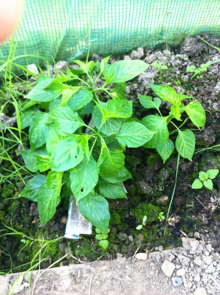 The Dorset nagas are the competition plants; the plants that we are willing on daily. The plants are still quite small, and I am wondering how to get some height onto them. They are sitting on clay soil, that may well be part of the problem. But they have heat, light, and regular feeding. It is a long way to October, granted, but these really need some. There is marked difference between the orange and chocolate habaneros. The orange habs, there are three of them, I think, there is luscious green foliage. The plants stand quite proudly, and for the moment, are flourishing. Stark contrast, to the waxy, bright green foliage of the chocolate habanero.