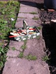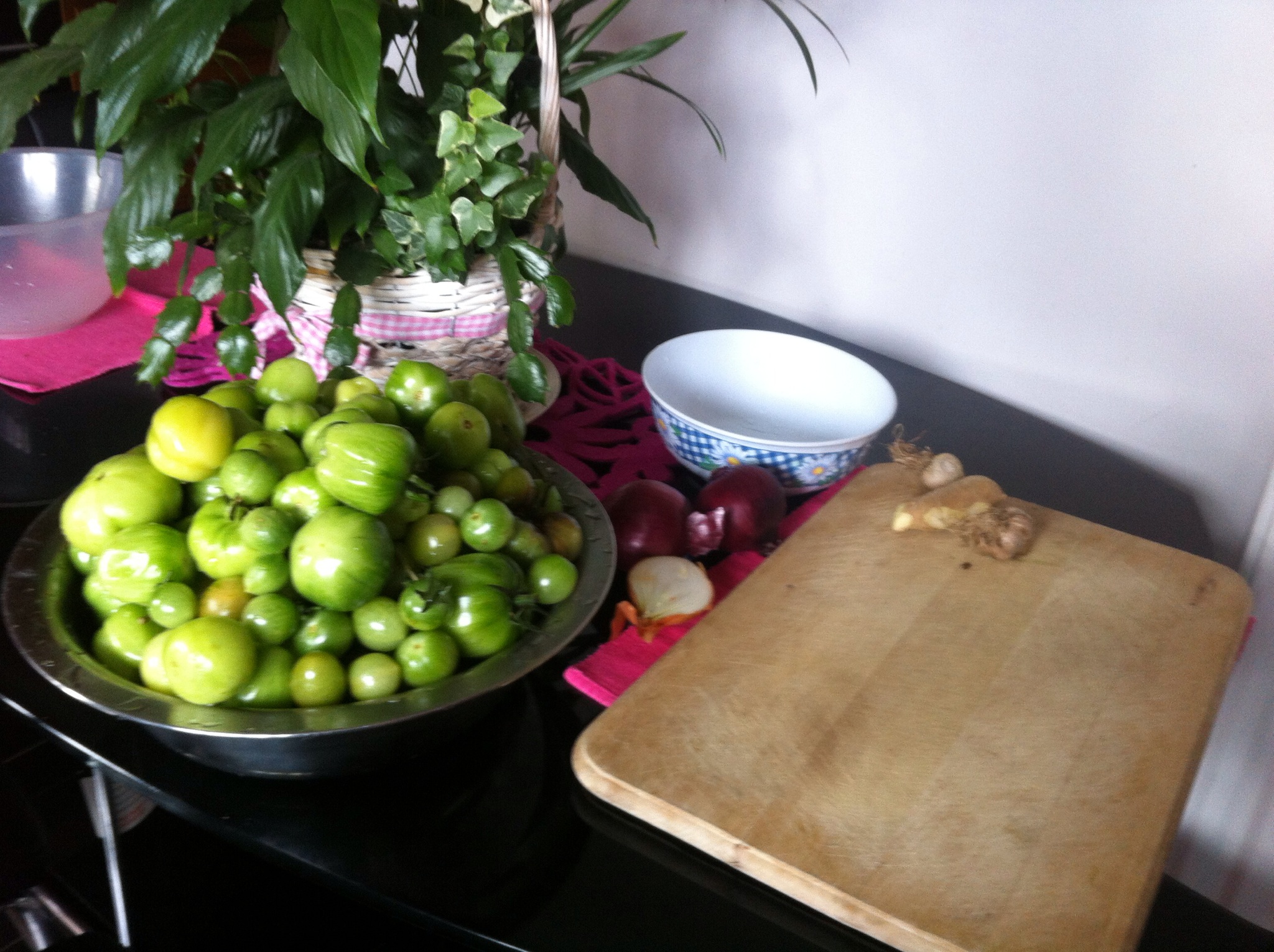 The last batch that we made was ‘Oberon’s relish’ which involve apples, mint and green tomato. This has all now gone to loving homes, so I thought about doing some experimenting. There were some plot grown scotch bonnets that need to be used, and I also harvested a fair bit of mint from the allotment. Home grown garlic was also used to form the base of the chutney.