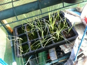 On the next window sill, we have the the aubergines. Dancer, diamond, tres hative de barbentane and black beauty have all come through. I am still waiting for early long purple to germinate. There was a pleasant surprise in how quickly the aubergine seeds have come up.