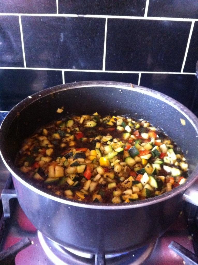 Home grown onions and garlic as well as a patty pan were used in this. The courgette was salted before hand.